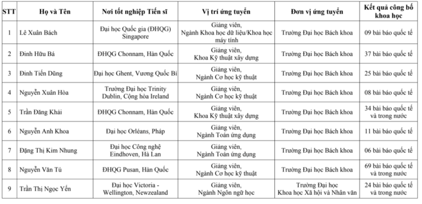 Trong số này, 19 nhà khoa học tốt nghiệp tiến sĩ tại các cơ sở uy tín như ĐH Quốc gia Singapore, ĐH Quốc gia Chonnam (Hàn Quốc), Đại học Ghent (Bỉ), Trinity College Dublin (Ireland), Đại học Orléans (Pháp), Đại học Công nghệ Eindhoven (Hà Lan), Đại học Victoria - Wellington (New Zealand)… Nhiều tiến sĩ có thành tích nghiên cứu nổi bật với hàng chục công bố khoa học, trong đó người có số lượng bài báo nhiều nhất là 69 bài.
