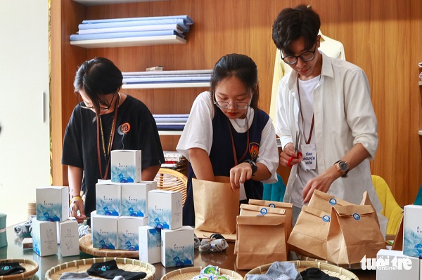 Các bạn tình nguyện viên cho những đôi vớ vào túi giấy - Ảnh: HỮU HƯỚNG