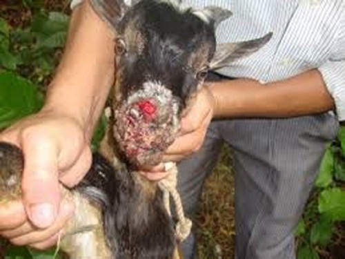 Biểu hiện khá rõ ràng khi xung quanh môi, trong miệng đều có mụn to, loét ra. Nặng hơn thì tai, mũi, bầu vú cũng bị viêm loét. Khiến cho dê bị khó nhai, khó nuốt, nước dãi có mùi hôi thối.