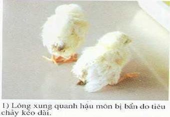 b) Triệu chứng: Gà con ủ rũ, ít vận động, mắt nửa nhắm nửa mở, cánh sã, bỏ ăn, uống nước nhiều, ỉa chảy phân hôi khắm, có bọt màu trắng, có khi có lẫn máu, phân bết quanh hậu môn. Mổ khám thấy xuất huyết ở tim gan, phổi, lách. Gà lớn thường bị bệnh ở dạng ẩn, triệu chứng không rỏ rệt, thường chỉ thấy ỉa chảy, phân bết đích, đẻ ít, trứng méo mó. Trứng ấp bị nhiễm bệnh thì tỉ lệ chết phôi cao, gà con nở ra yếu, hở rốn nhiều, lòng đỏ không tiêu hết…