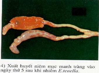 b) Triệu chứng bệnh: Gà ủ rũ bỏ ăn uống nhiều nước, xệ cánh, xù lông, đi đứng không vững, ngoẹo đầu trên lưng, phân loãng lúc đầu màu xanh chuyển dần sang màu nâu có lẫn máu, tỉ lệ chết cao. Gà kém ăn, gầy ốm dần, đẻ giảm, rất dễ kế phát các bệnh đường ruột khác. Manh tràng sưng to và xuất huyết.