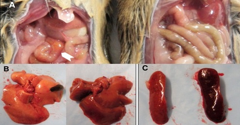 + Bệnh tích: Niêm mạc khí quản xuất huyết nặng, có thể chứa bọt lẫn máu; Phổi sung huyết, xuất huyết điểm kèm theo phù; Tim sung huyết, có thể kèm theo xuất huyết điểm ở nội tâm mạc; Tuyến ức phù dịch keo; Lách sưng to, sung huyết màu tím xanh; Gan sưng to, dễ vỡ, bề mặt nhám, xuất huyết nặng; Túi mật sưng to và dày; Tử cung ở thỏ có chửa sung huyết màng nhầy kèm theo xuất huyết điểm, chết thai; Thận sưng to từng phần, màu tím nhạt, sung huyết, xuất huyết điểm đầu đinh ghim ở vỏ thận; Bàng quang ứ đọng nước tiểu.