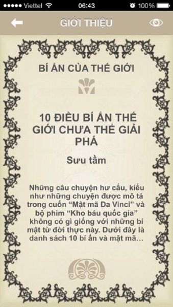 Làm một ứng dụng tổng hợp, bao gồm rất nhiều những vấn đề bí ẩn, không thể giải thích trên Thế giới và thậm chí là cả ở Việt Nam. Mỗi câu chuyện đều trong đó đều là những sự thật được ghi nhận, và không ít các nhà khoa học, nhà nghiên cứu tâm linh đã bỏ thời gian tìm hiểu, nghiên cứu, nhưng câu trả lời vẫn còn là một ẩn số. Và cho tới bây giờ, tất cả cũng vẫn còn là những hiện tượng huyền bí, không ai có thể hiểu, hay đưa ra bất kỳ lời giải thích hợp lý nào.