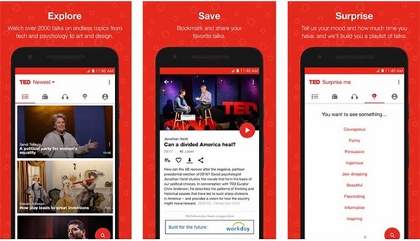 Chắc hẳn nhiều người đã rất quen thuộc với TED. TED là nơi mà mọi người nói và chia sẻ về nhiều lĩnh vực khác nhau của cuộc sống. Những người chia sẻ ở đây hầu như là những người làm việc trong các ngành công nghiệp lớn. Họ thực hiện những buổi TED talks để kể về những gì họ đang làm, diễn thuyết về các chủ đề và những điều mang tính giáo dục khác. Đây chưa phải là một trong những ứng dụng chứa nhiều nội dung nhất. Tuy nhiên đây là phương thức bạn tiếp nhận mọi thứ từ nhiều khía cạnh khác nhau và nhận ra công nghệ đang thay đổi nhanh chóng như thế nào.