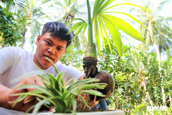 Anh Nguyễn Minh Chí tạo hình cho cây bonsai dừa - Ảnh: MẬU TRƯỜNG