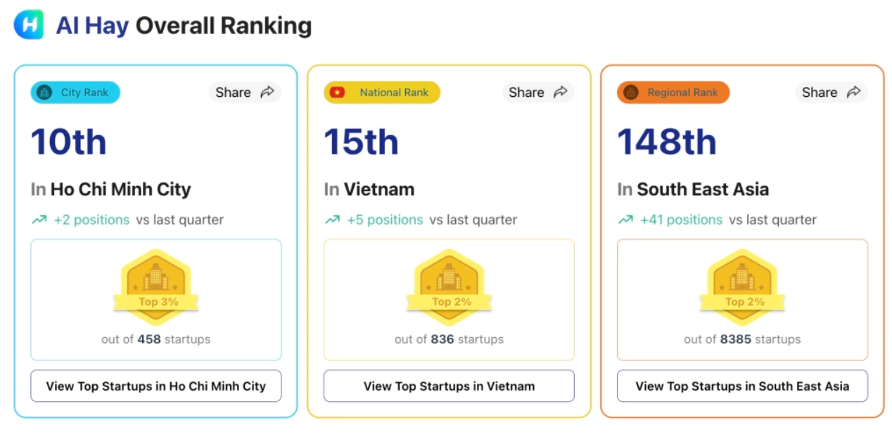 AI Hay, do kỹ sư Việt phát triển, là startup duy nhất thuộc lĩnh vực phần mềm và dữ liệu có tên trong top 10 hệ sinh thái khởi nghiệp TP HCM, theo StartupBlink.