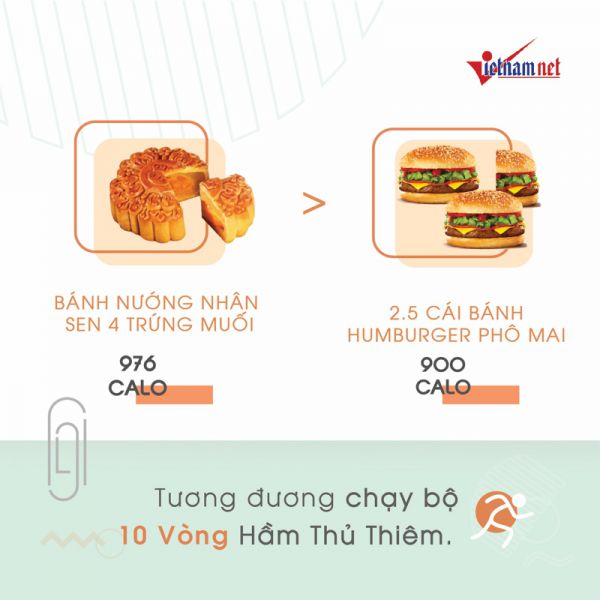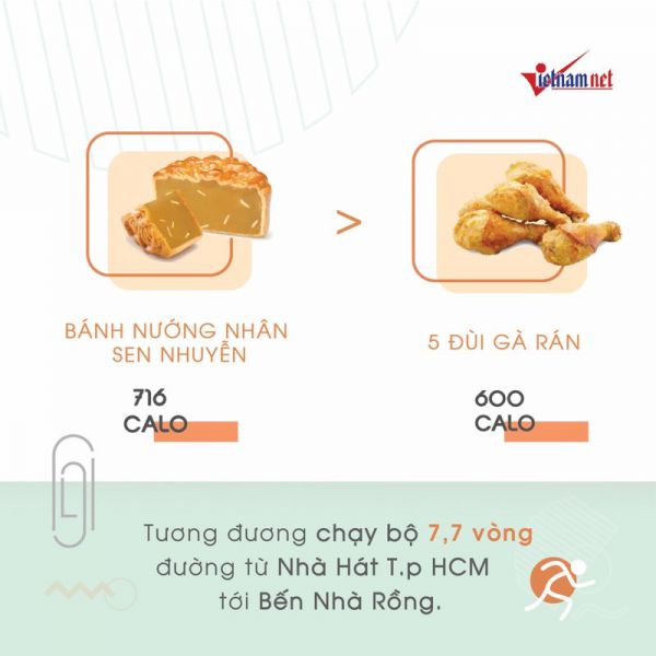 Ai cũng biết thức ăn nhanh gây béo nhiều như thế nào. Vậy mà chỉ ăn 1 chiếc bánh nướng nhân sen 4 trứng muối đã lên cân như vừa ăn 2,5 chiếc hamburger rồi! Với lượng calo khủng như vậy, lên tinh thần chạy 10 vòng Hầm Thủ Thiêm từ bây giờ cũng không muộn.