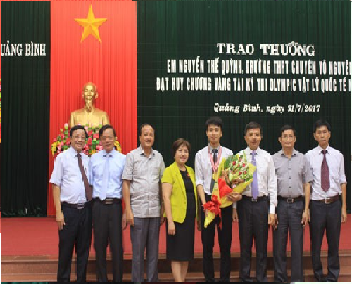 Chủ tịch UBND tỉnh Quảng Bình tặng hoa và quà chúc mừng Nguyễn Thế Quỳnh khi Quỳnh đạt HCV tại kỳ thi Olympic Vật lý Quốc tế năm 2017. (Ảnh: Quangbinh.gov.vn)