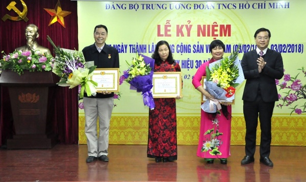 Tại lễ kỷ niệm, nhằm ghi nhận quá trình phấn đấu rèn luyện và đóng góp của đảng viên, Ban Thường vụ Đảng ủy khối các cơ quan Trung ương đã quyết định trao tặng Huy hiệu 30 tuổi Đảng cho 04 đảng viên của Đảng bộ Trung ương Đoàn (gồm các đồng chí: Nguyễn Thị Thâu - Chi bộ Ban phát thanh TTN; Lê Thị Lam Hương - Chi bộ Văn phòng Ủy ban Quốc gia về TN Việt Nam; Hoàng Vân - Đảng bộ Học viện TTN Việt Nam; Phạm Thọ Hợp - Đảng bộ Học viện TTN Việt Nam).
