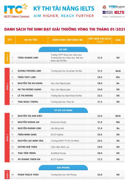 Căn cứ Thể lệ và kết quả thi IELTS của thí sinh, Ban Tổ chức ITC công bố danh sách thí sinh đạt giải thưởng Vòng thi tháng 01/2021, Kỳ thi Tài năng IELTS năm 2021.