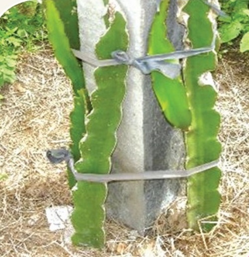 Đặt 4 hom quanh 4 phía của trụ, cao hơn mặt đất 0,5 cm để tránh thối gốc. Áp phần phẳng của hom vào mặt phẳng của trụ để sau này hom ra rễ bám nhanh vào trụ. Dùng dây nilông hoặc dây vải buộc nhẹ hom vào trụ để tránh gió làm lung lay, sau đó tưới nhẹ và tủ rơm hoặc cỏ khô để giữ ẩm.