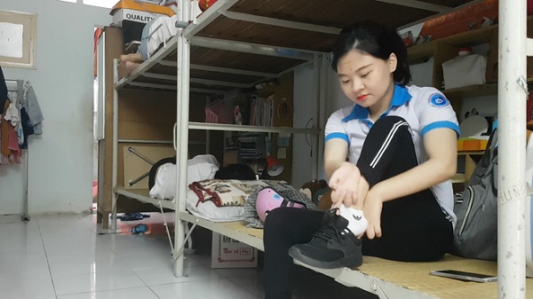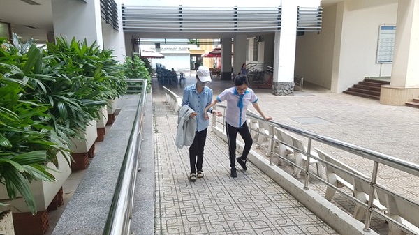 Một tay vịn thành giường, một tay bám vào người bạn cùng phòng, Tuyết Nhung dần dần ra đến chỗ xe đang chờ. Ngồi trên xe ôm, Tuyết Nhung chia sẻ: “Gần 3 năm nay mình đã làm như thế để cố gắng chủ động trong mọi thứ. Còn khi đến trường mình ngồi tạm ghế đá rồi nhờ các bạn dìu lên lớp”.