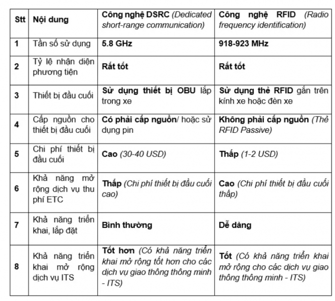 Theo đại diện VDTC, cả hai công nghệ đều có ưu và nhược điểm, tuy nhiên công nghệ RFID phù hợp với văn hóa, môi trường giao thông tại Việt Nam, nhờ 3 ưu điểm là mức độ nhận diện chính xác cao, chi phí sử dụng thấp và dễ dàng triển khai lắp đặt.